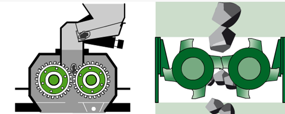 當(dāng)物料進(jìn)入機(jī)器的破碎腔以后,物料受到轉(zhuǎn)動輥軸的嚙力作用,使物料被逼通過兩輥之間,同時受到輥軸的擠軋和剪磨,物料即開始碎裂,碎裂后的小顆粒沿著輥?zhàn)有D(zhuǎn)的切線,通過兩輥軸的間隙,向機(jī)器下方拋出,超過間隙的大顆粒物料,繼續(xù)被破碎成小顆粒排出。