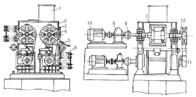 1—給料口;2—機(jī)架;3—帶輪;4—軸承;5—切削裝置;6—彈簧;7—輥?zhàn)樱?br /> 8—聯(lián)軸器;9—減速器;10—電動(dòng)機(jī);11—干油潤滑裝置;12—鏈輪