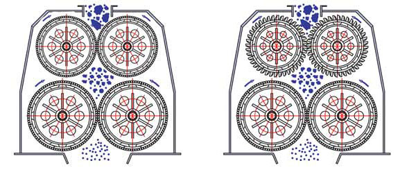 四輥破碎機(jī)配置四個(gè)碾輥,根據(jù)用戶需要的破碎粒度,分為兩種機(jī)型: